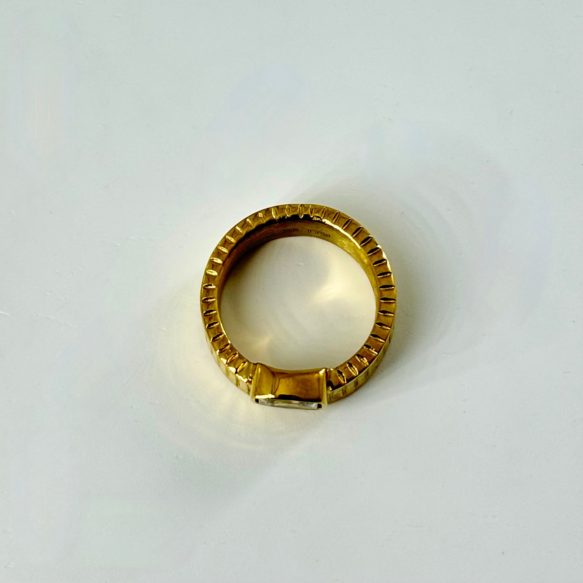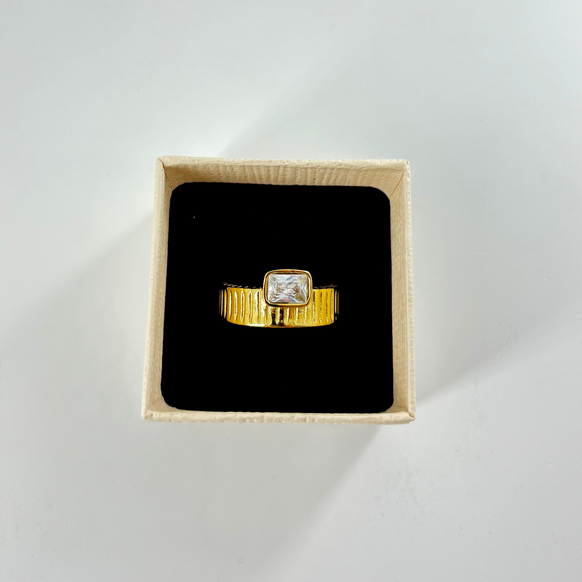 Make a bold statement with this textured gold band ring, featuring a striking rectangular crystal at its center. With its unique handcrafted finish and anti-tarnish polish, this piece is perfect for everyday elegance or special occasions.