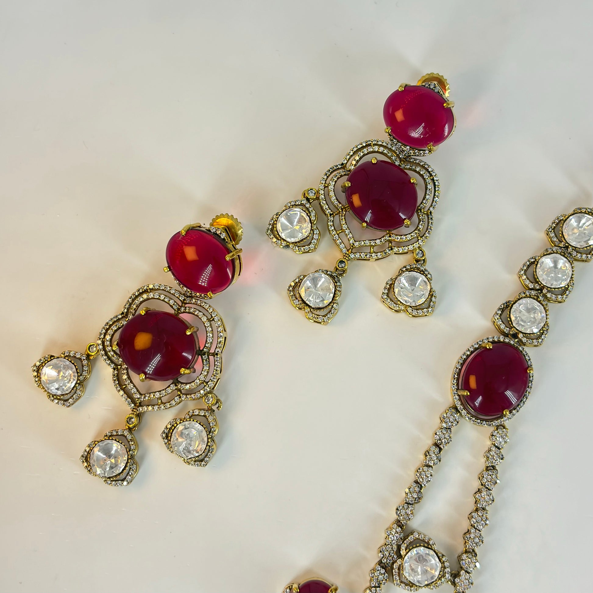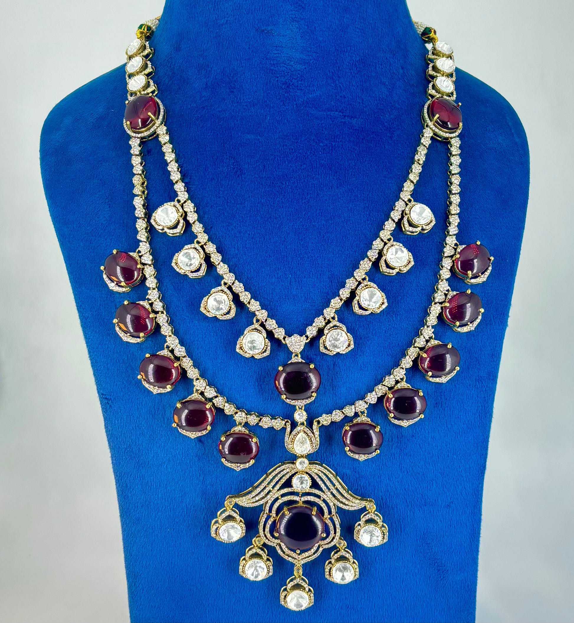 Indulge in the charm of luxury craftsmanship with this stunning layered necklace, featuring brilliant Moissanite stones, deep garnet-hued gems, and classic Polki settings. The cascading design, paired with intricate detailing, makes it a perfect heirloom piece for grand occasions.