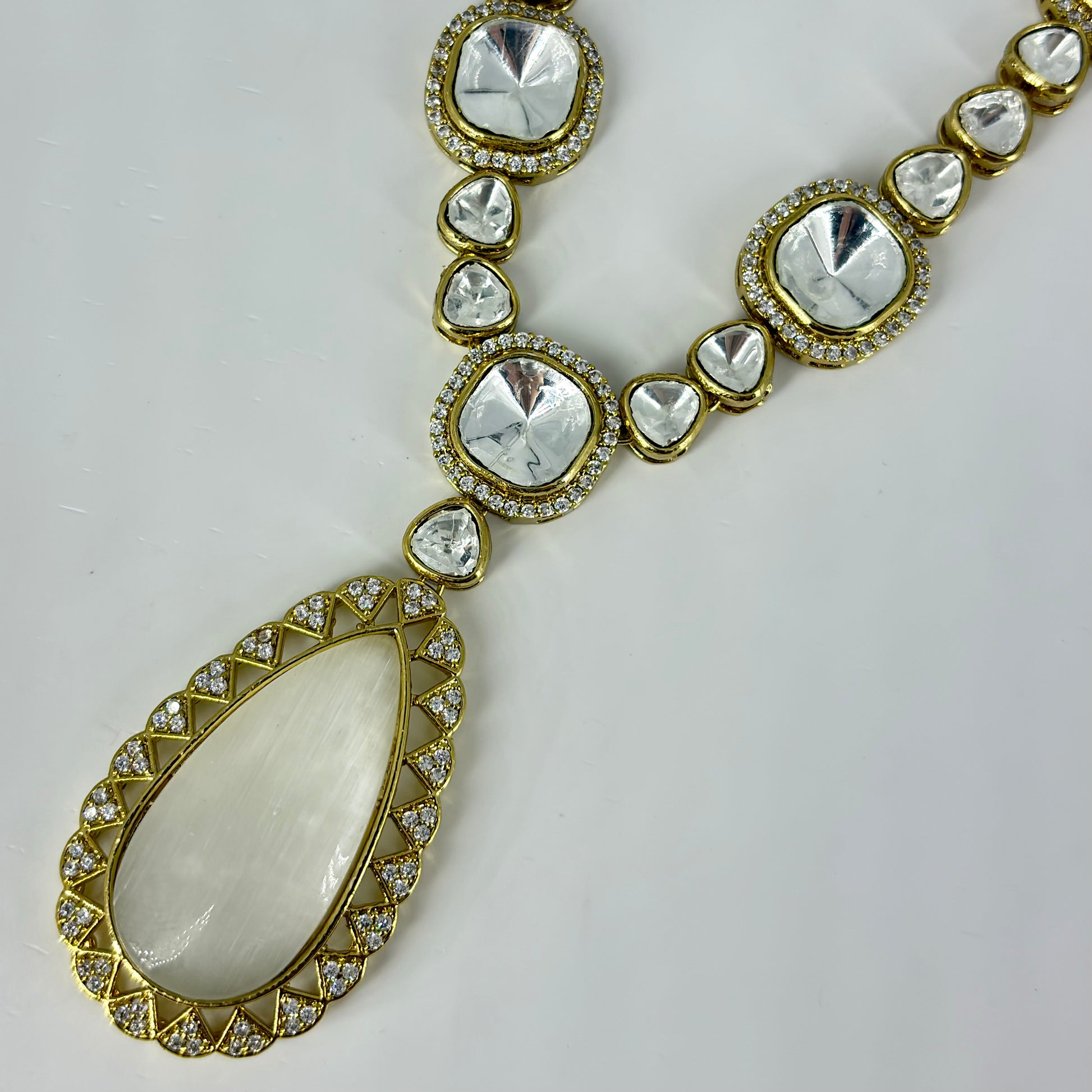 A masterpiece of heritage craftsmanship, this Polki necklace set exudes grace and sophistication. Designed with unmatched elegance, the teardrop pendant and matching earrings feature intricate Polki detailing with 18K gold plating, making it a true heirloom piece.
