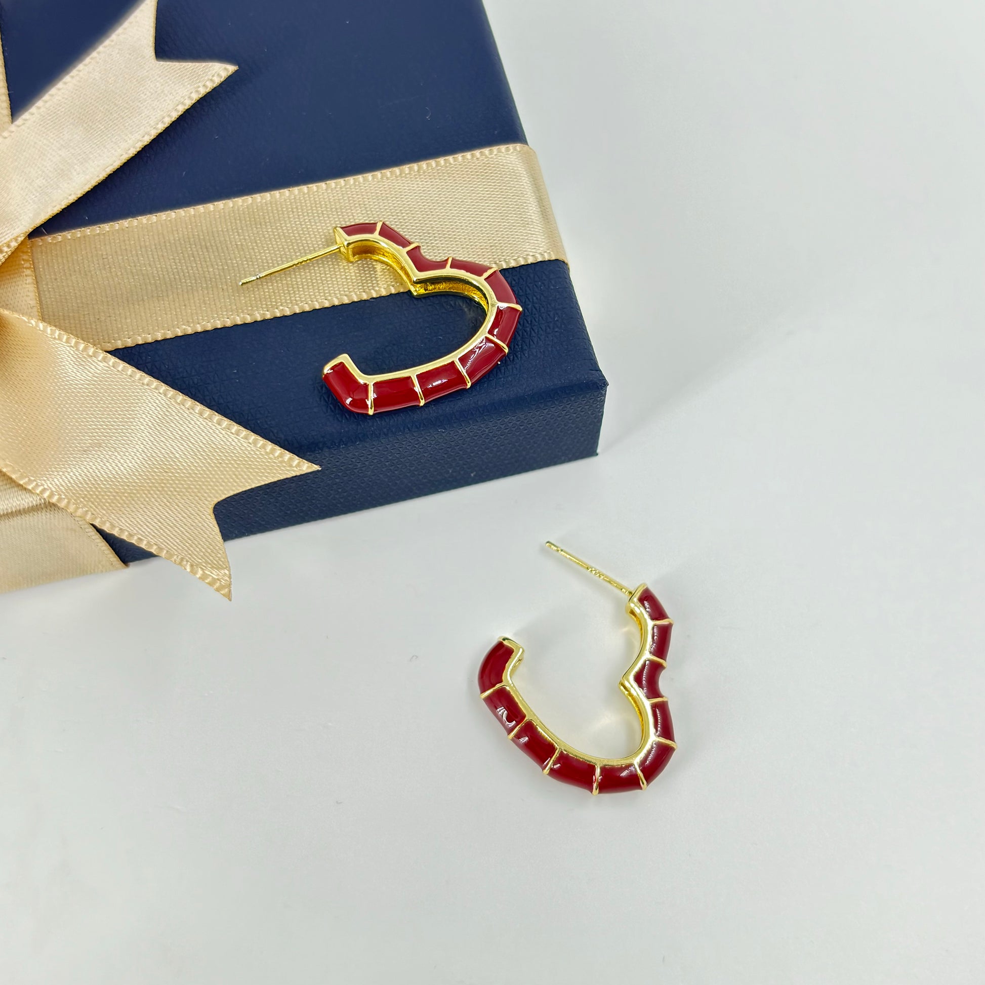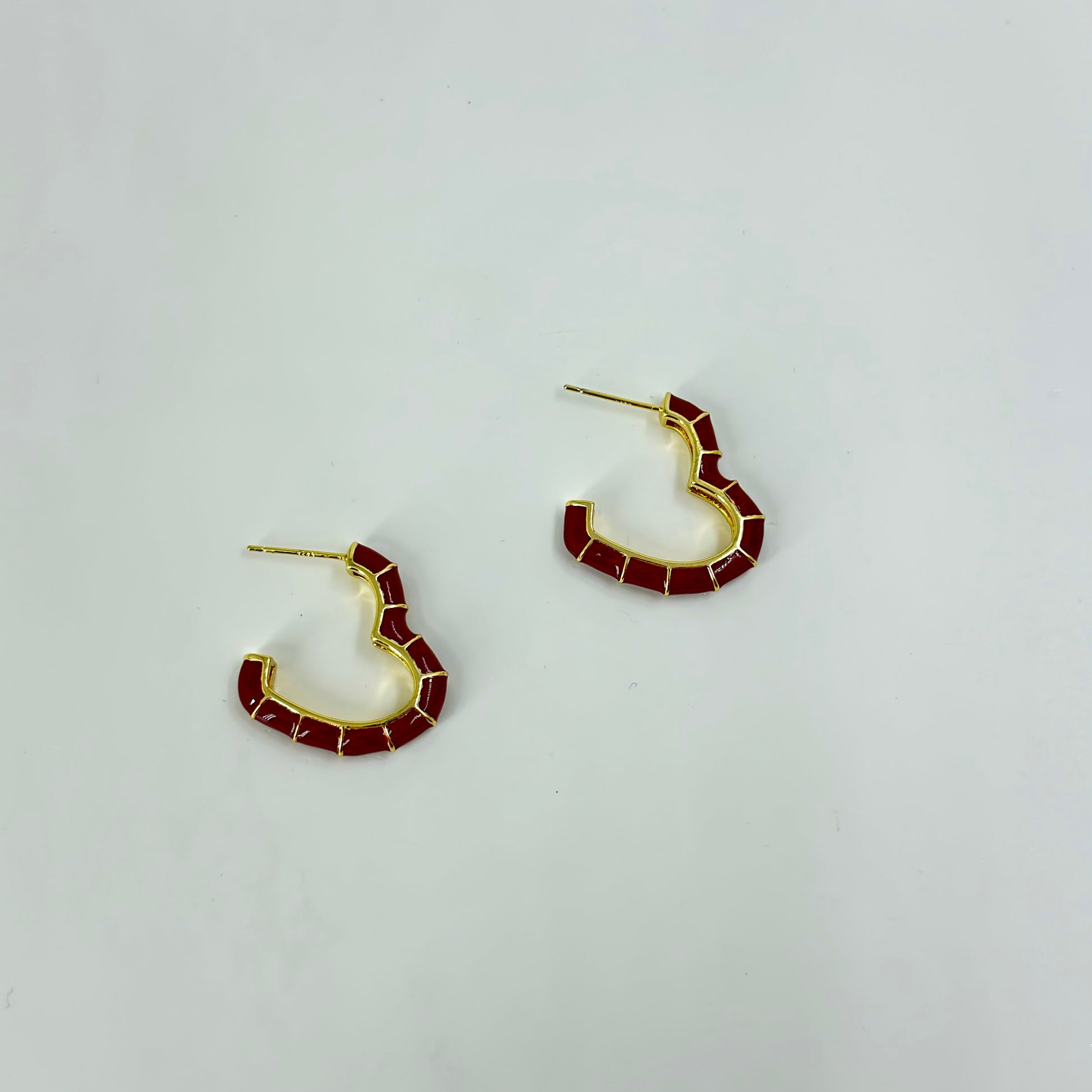 Turn heads with these striking heart-shaped hoop earrings, beautifully detailed with a bold red enamel finish and gold accents. The perfect fusion of modern charm and classic appeal, making them a must-have for your collection.