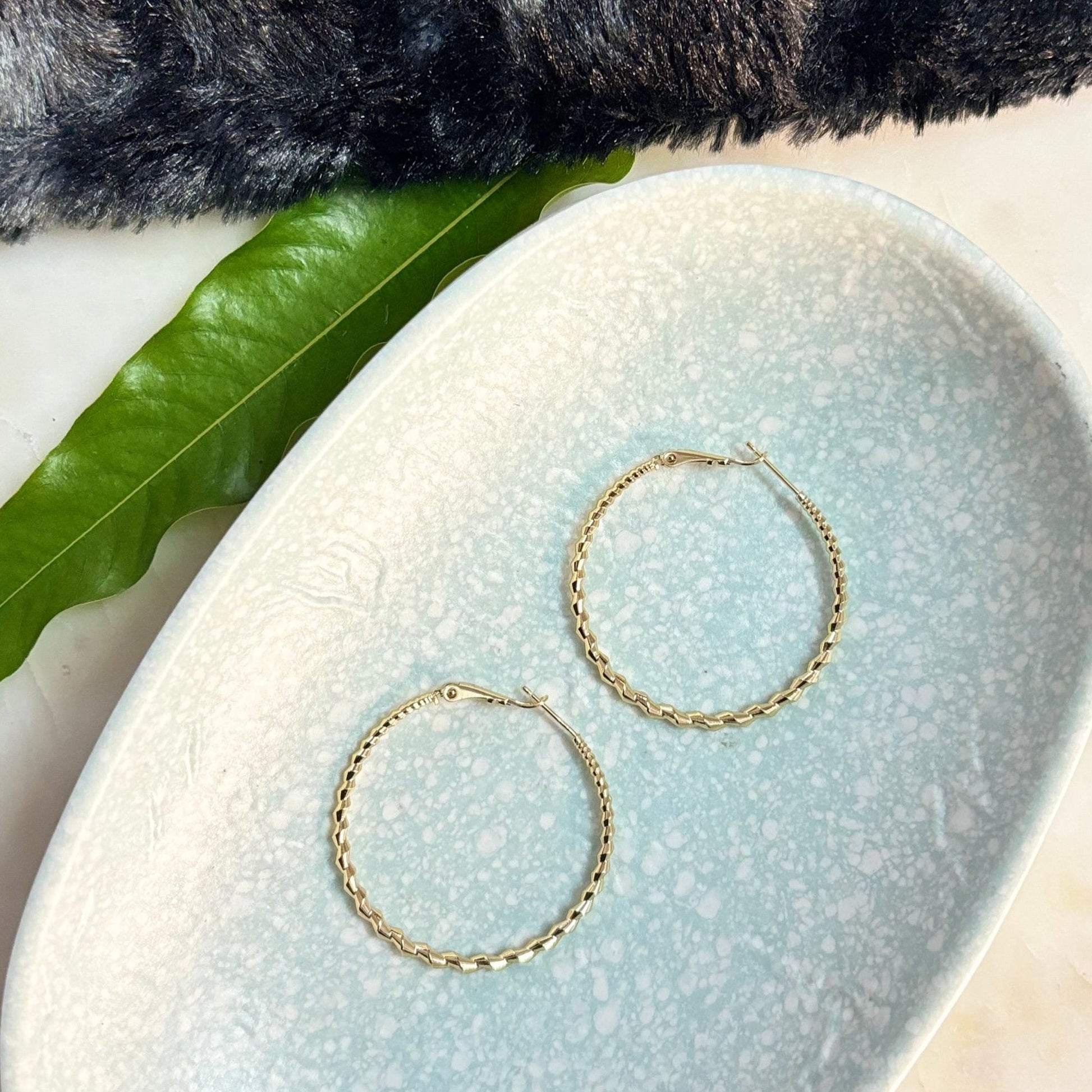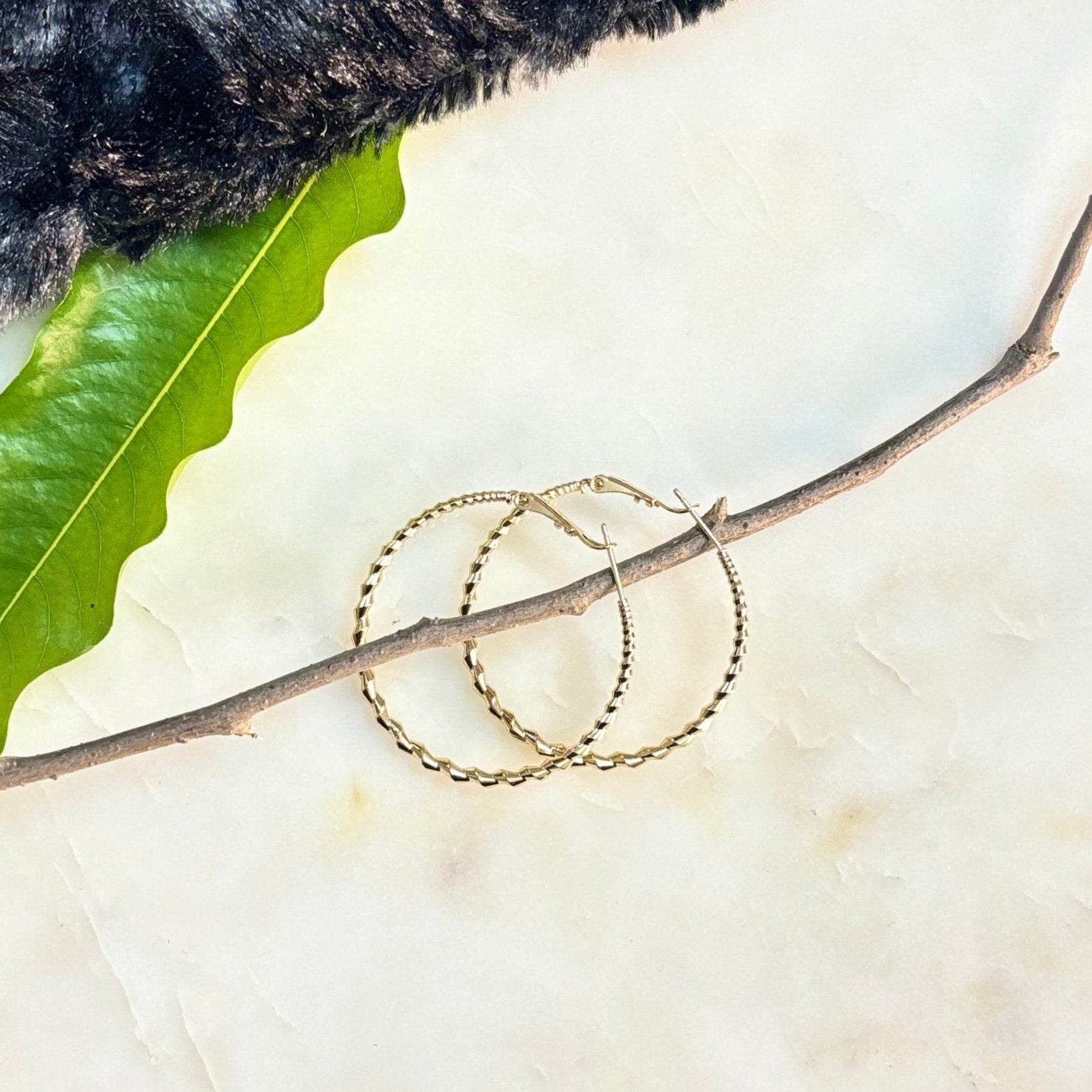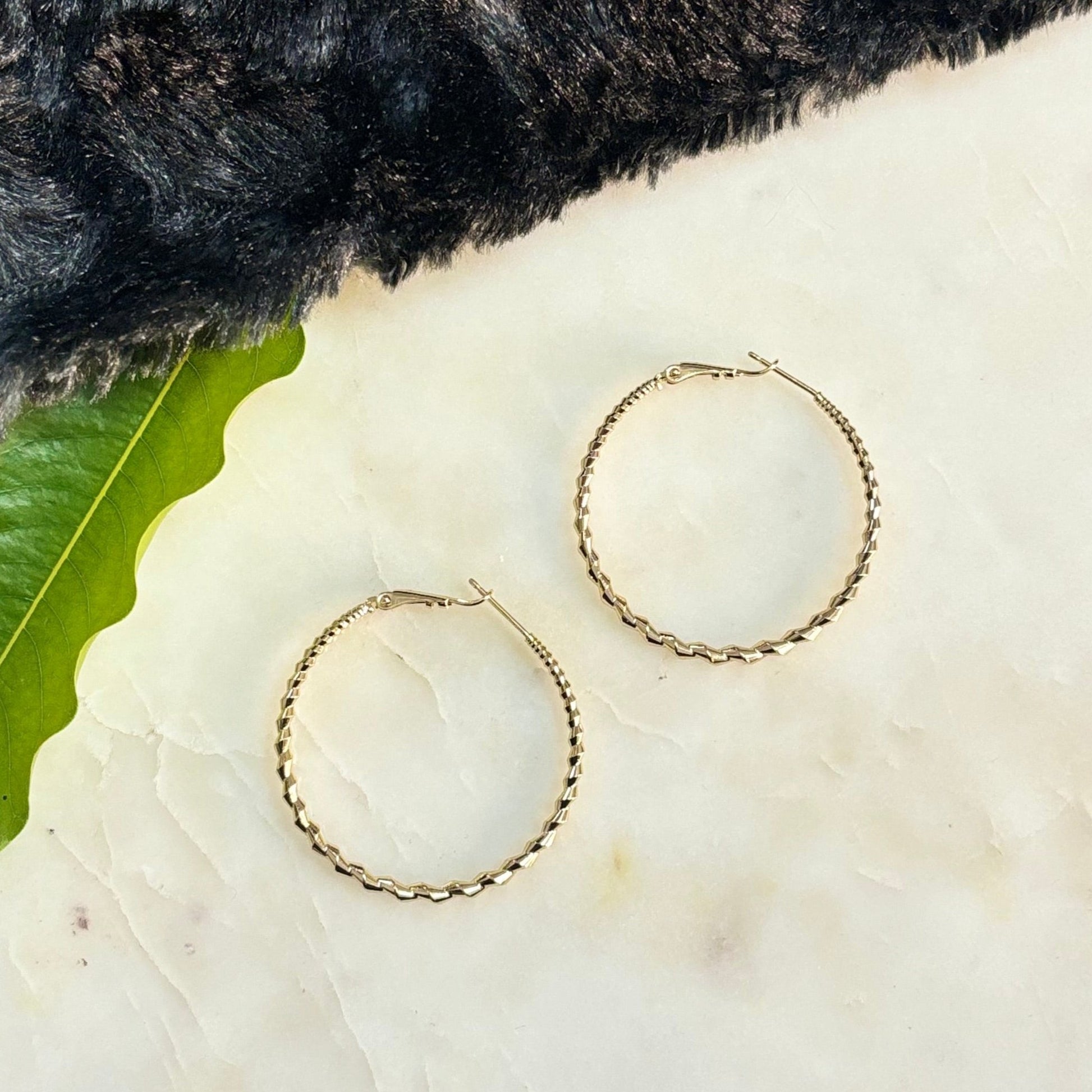 Classic meets modern with these intricately textured gold hoop earrings, perfect for elevating any outfit. Lightweight and timeless, they’re a must-have staple.