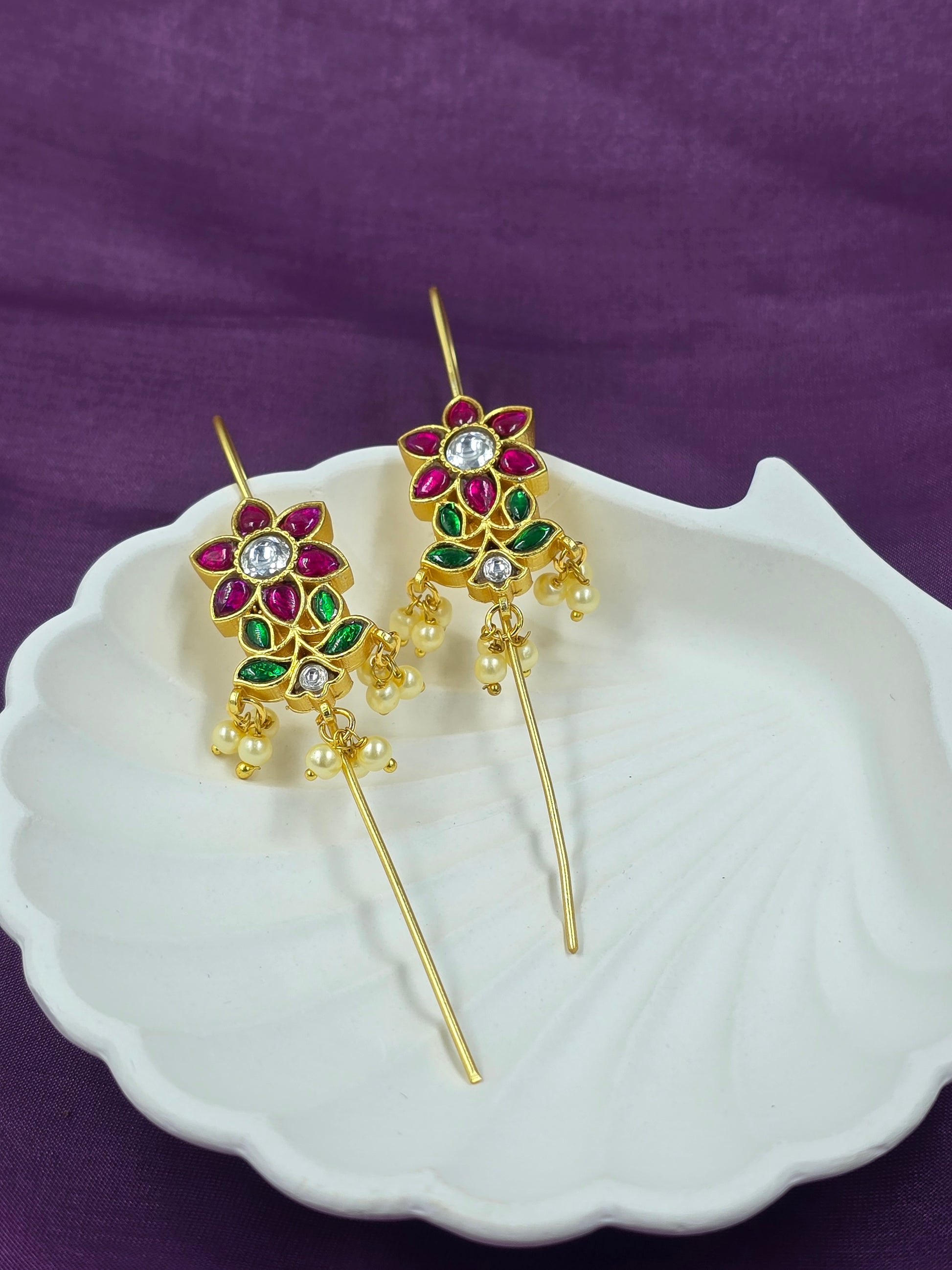 Embrace traditional elegance with these stunning Gold-Plated Floral Threader Earrings. This unique design combines a beautifully crafted flower motif—adorned with vibrant Ruby and Emerald stones.