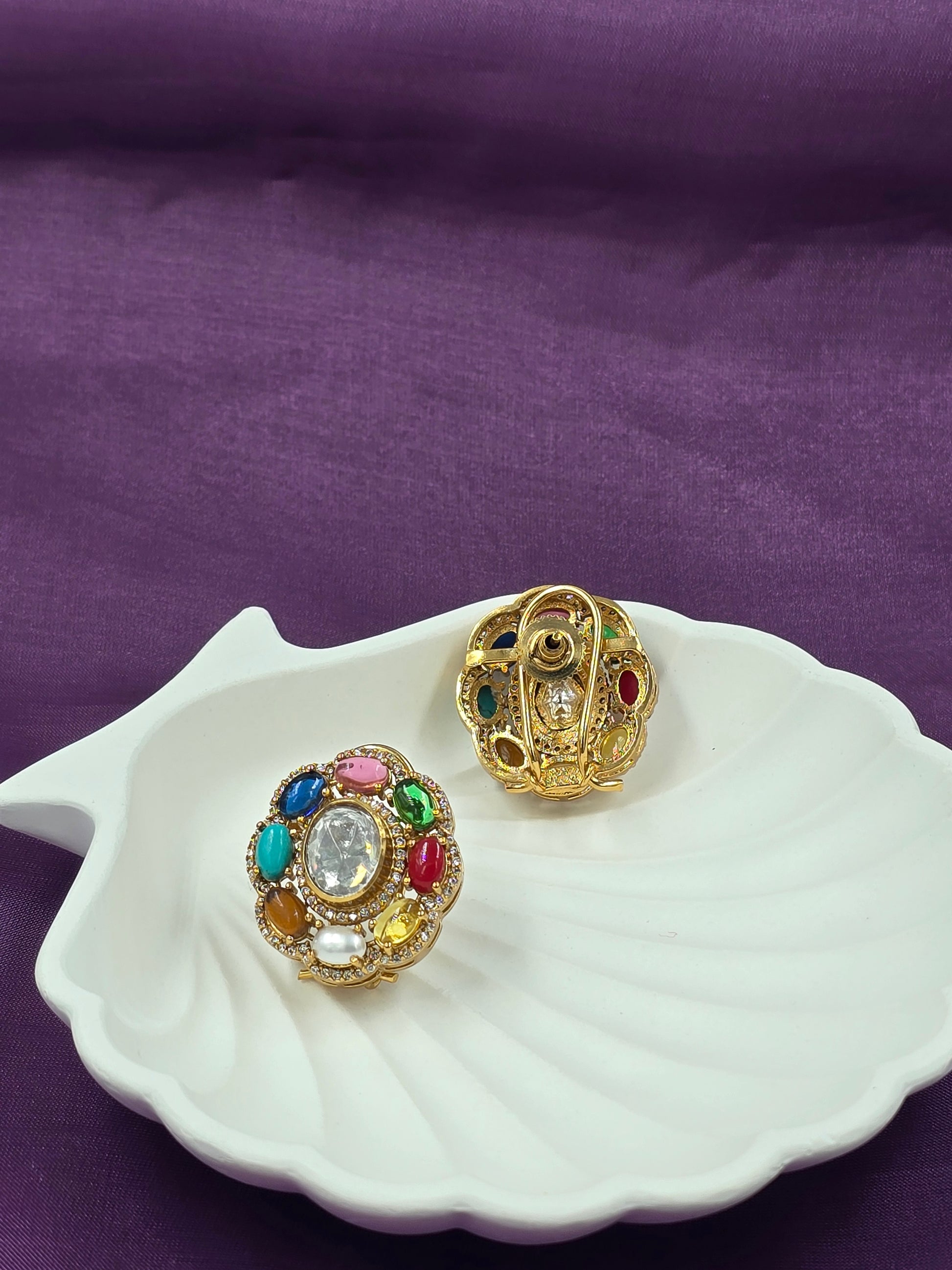 These premium statement studs feature a stunning oval center stone surrounded by beautifully cut kundan pieces, giving a rich and luxurious shine. Crafted in high-quality gold plating, they are perfect for weddings, festive occasions, and elegant ethnic looks. A timeless kundan accessory that adds instant royalty to any outfit.