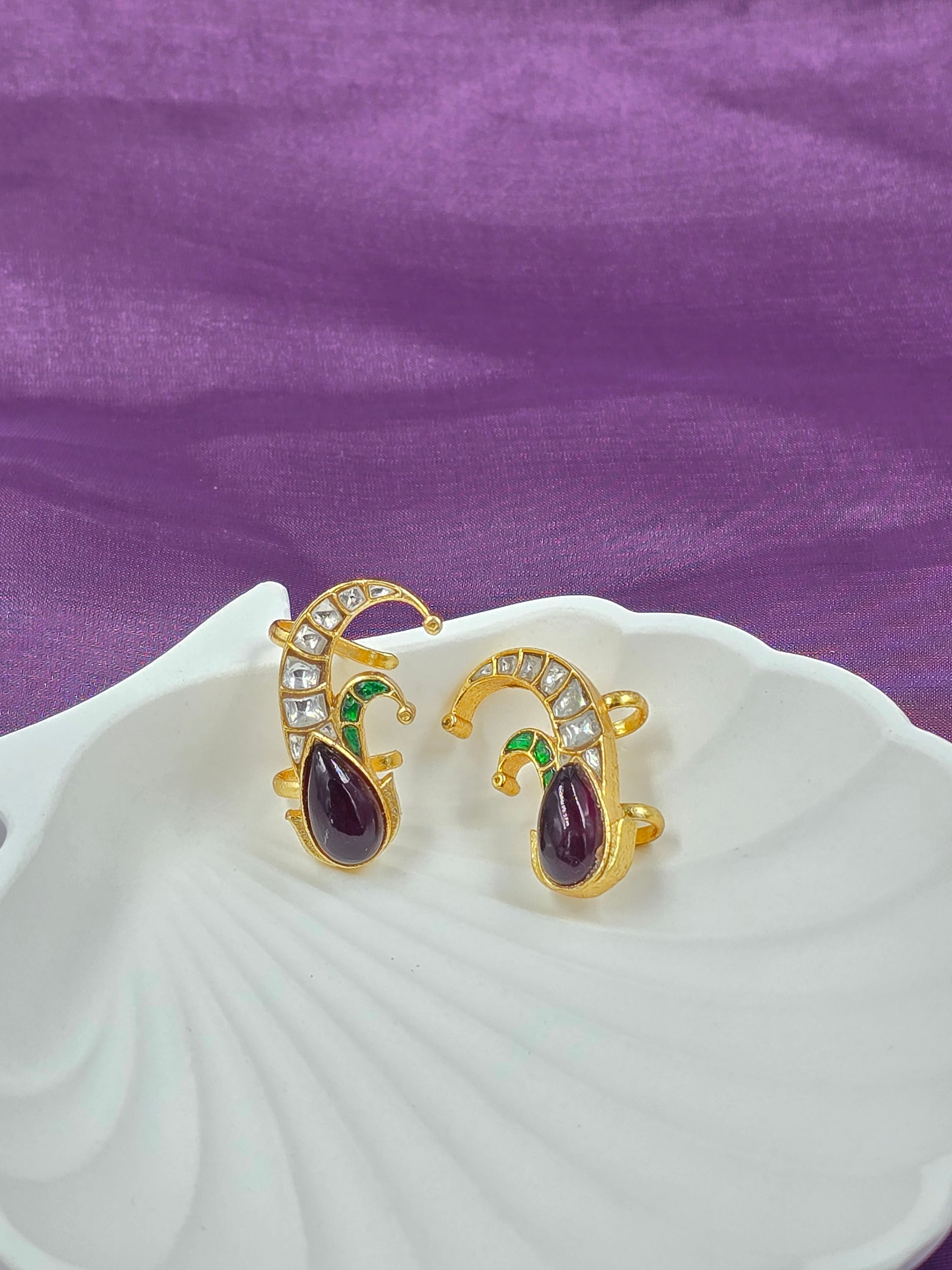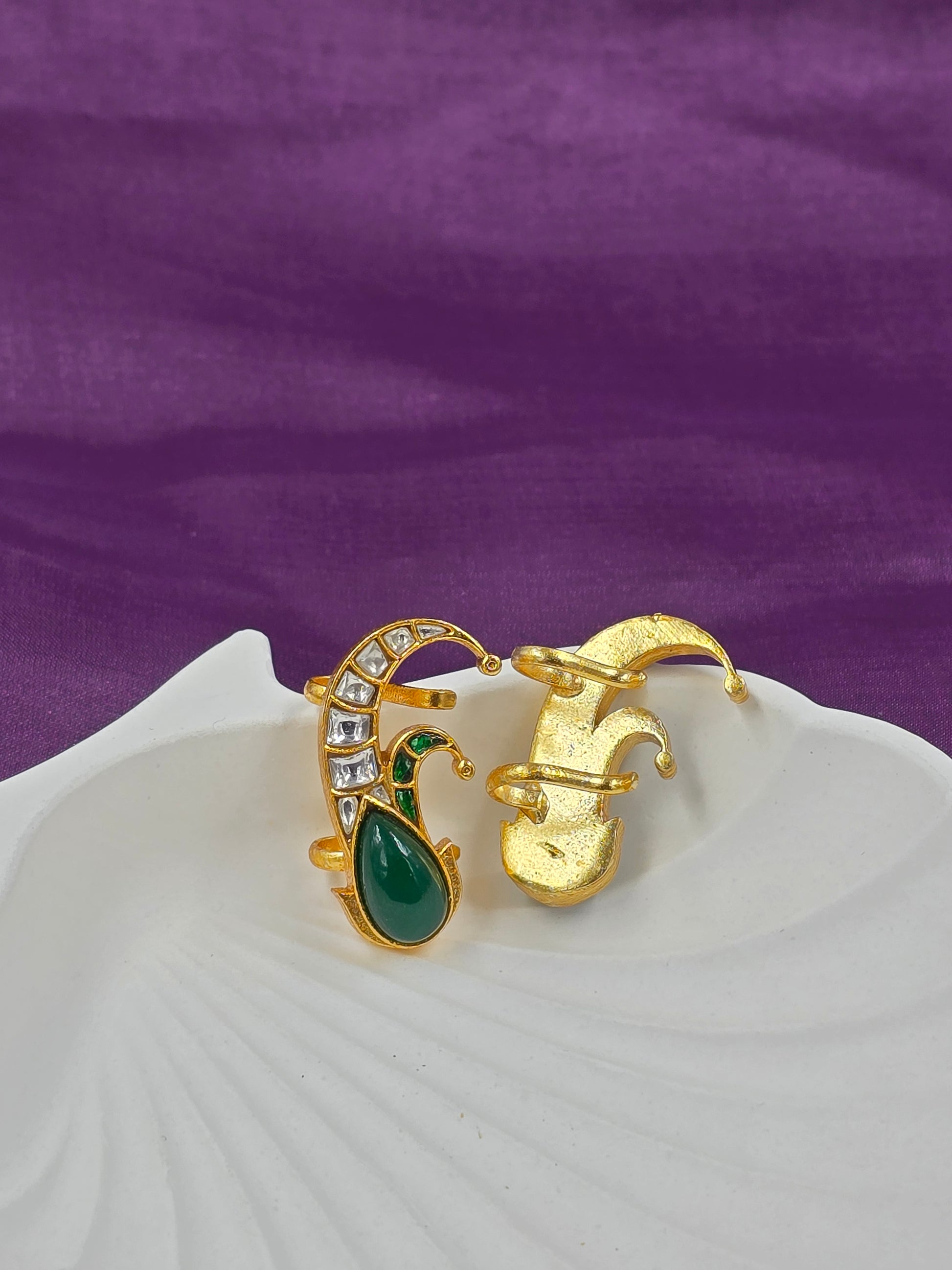 This stunning peacock-style earcuff features a rich green teardrop stone paired with sparkling kundan accents, giving it a royal and elegant look. Crafted in premium gold-plated finish, it sits comfortably on the ear and adds effortless charm to any festive or party outfit. A perfect statement ear accessory for modern ethnic styling.