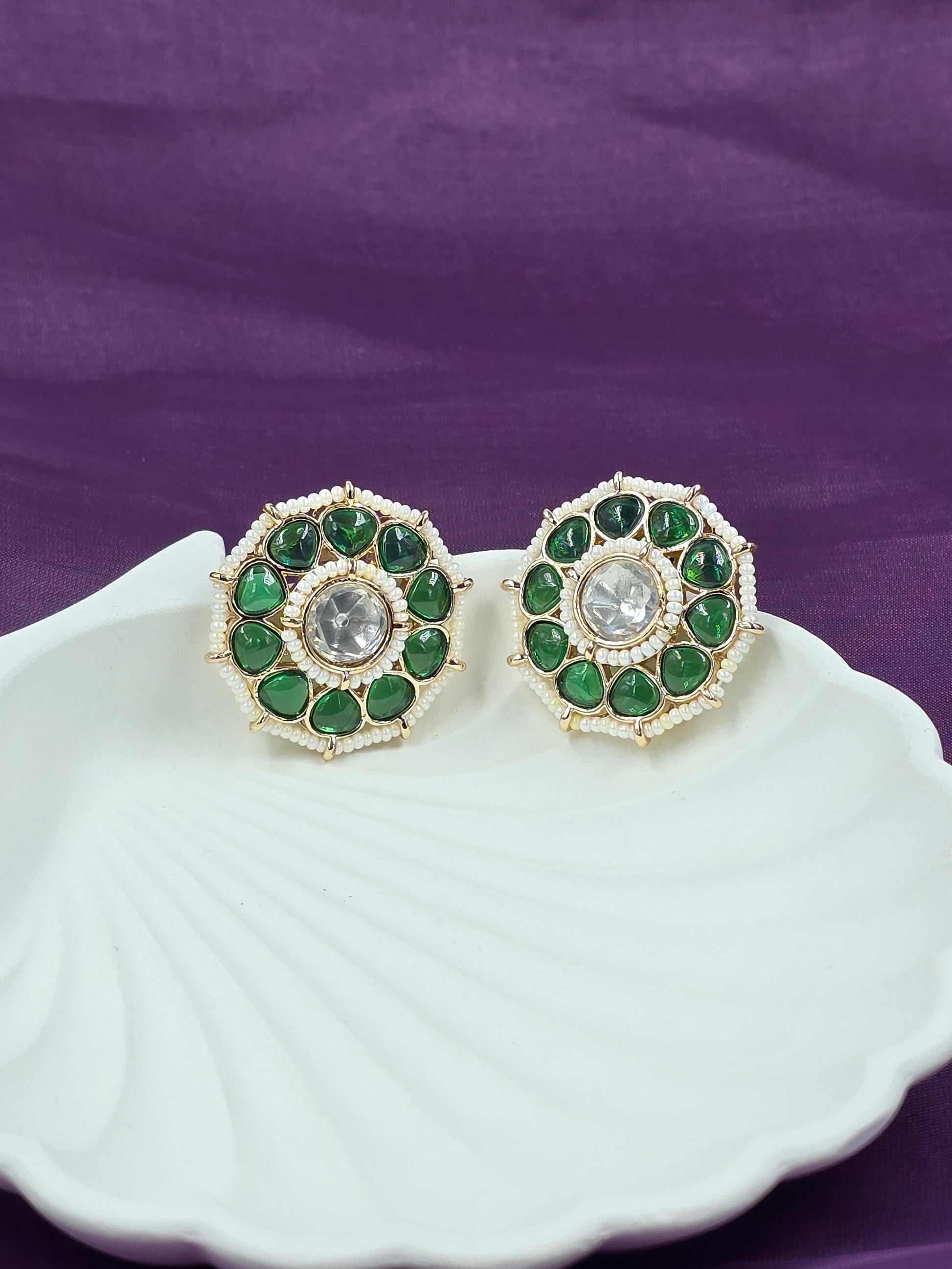 These elegant floral stud earrings feature radiant green kundan stones highlighted with a sparkling central mirror stone and delicate pearl edging. Perfect for festive wear, weddings, and traditional outfits, they add a vibrant pop of color with timeless charm. A must-have statement accessory for your jewellery collection.