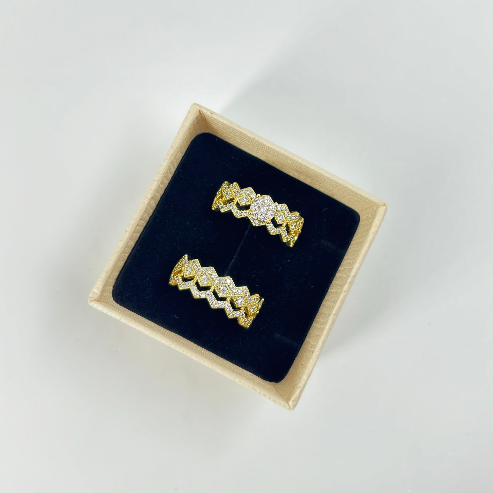 A stunning geometric design encrusted with shimmering stones, this gold-plated ring is the epitome of luxury and sophistication. Perfect for adding a touch of sparkle to your evening look or elevating your everyday style.