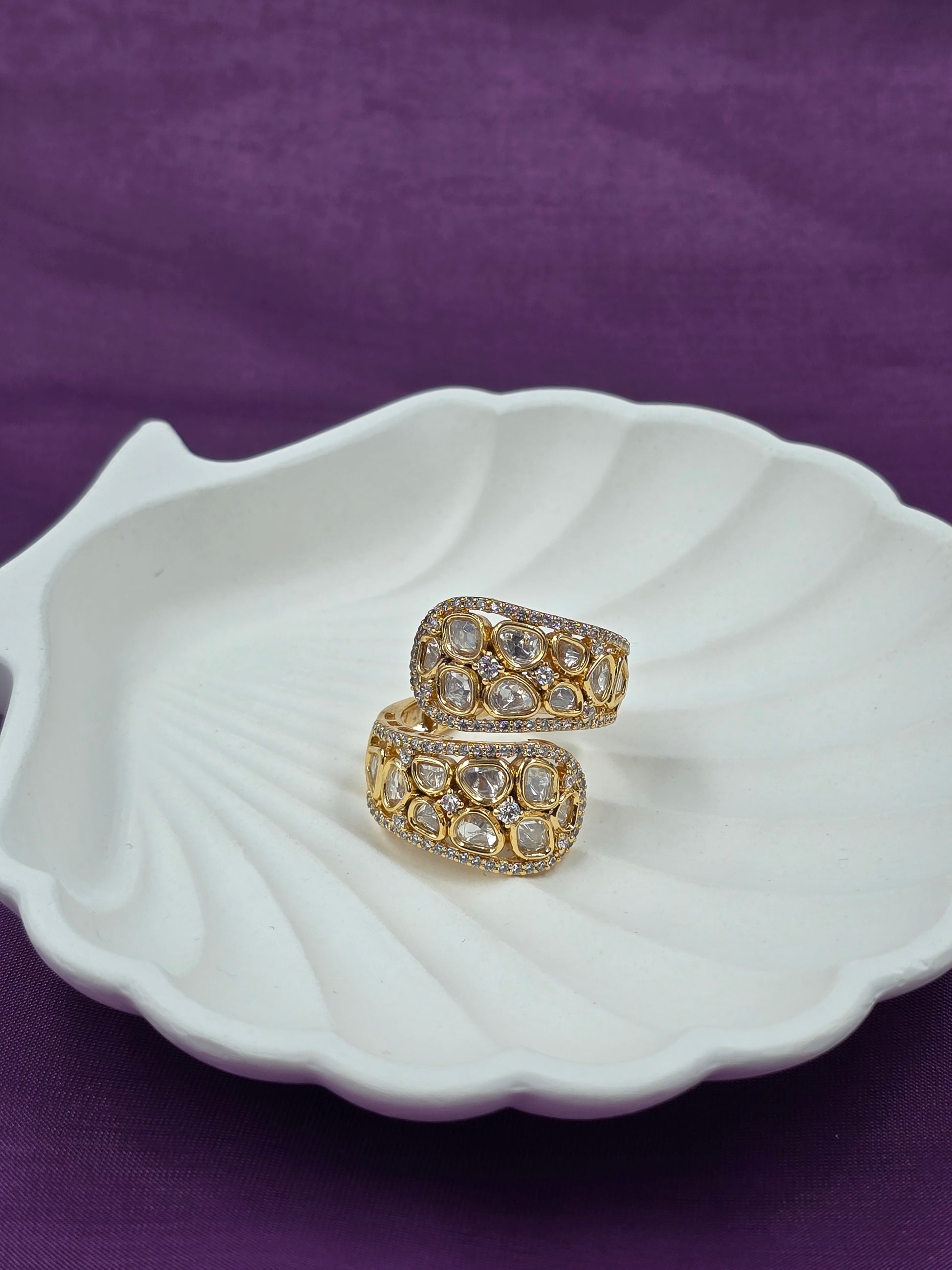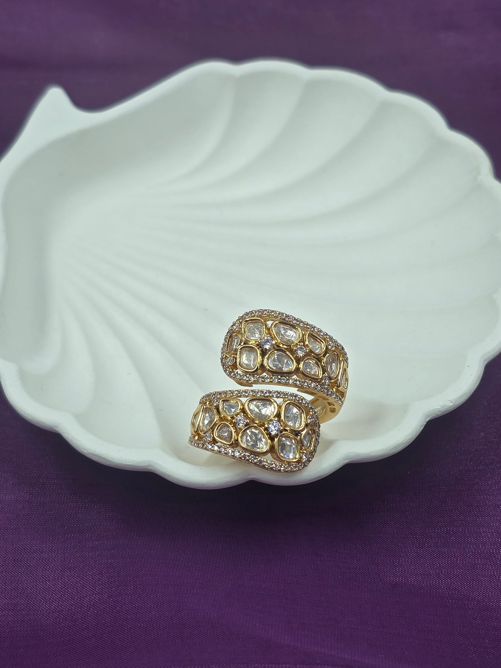 Shop this trendy Matt Gold Double-Band Ring featuring a full surface of sparkling uncut Polki Kundan stones. Bold, adjustable, and perfect for cocktail parties and modern ethnic wear.