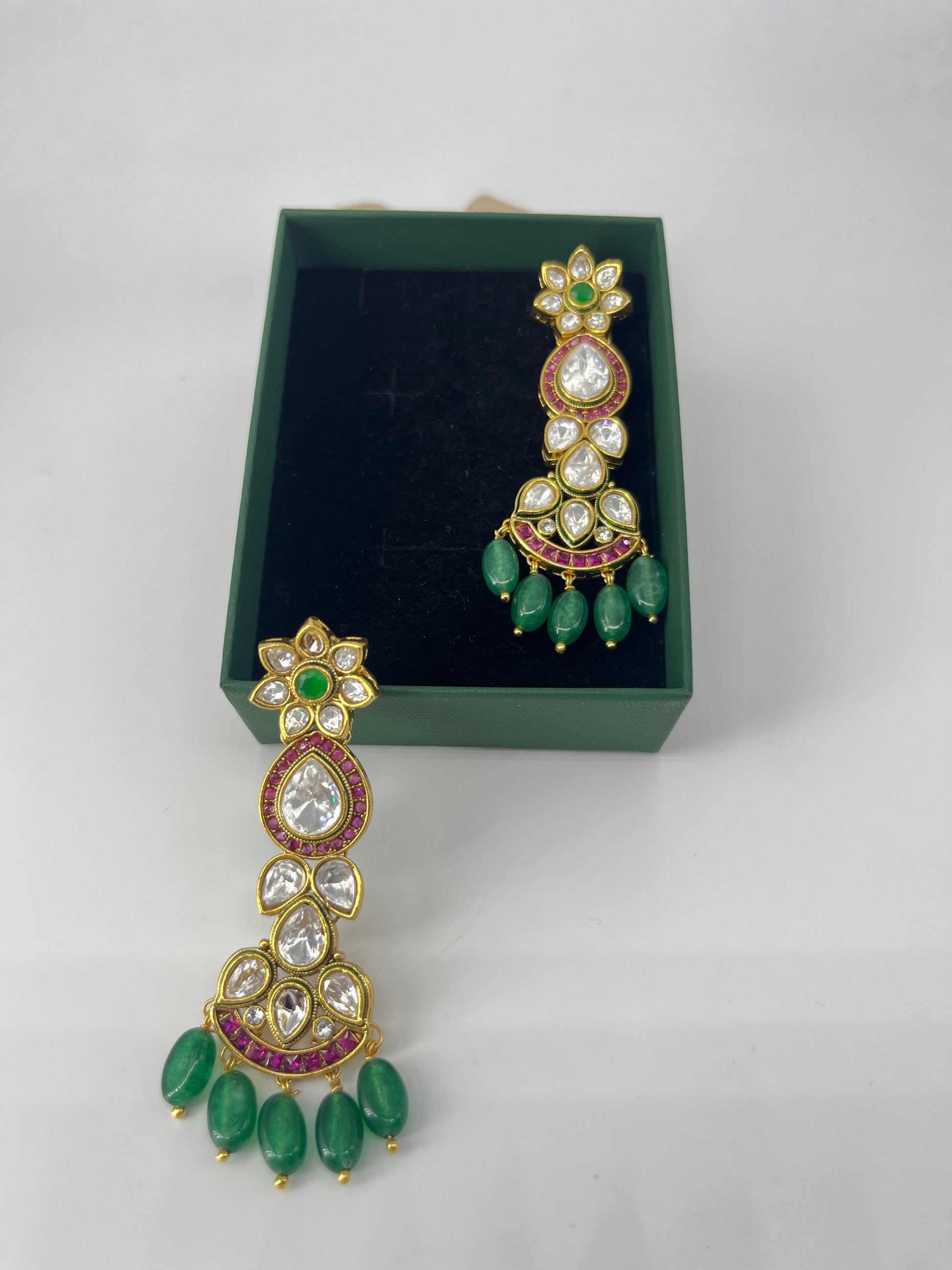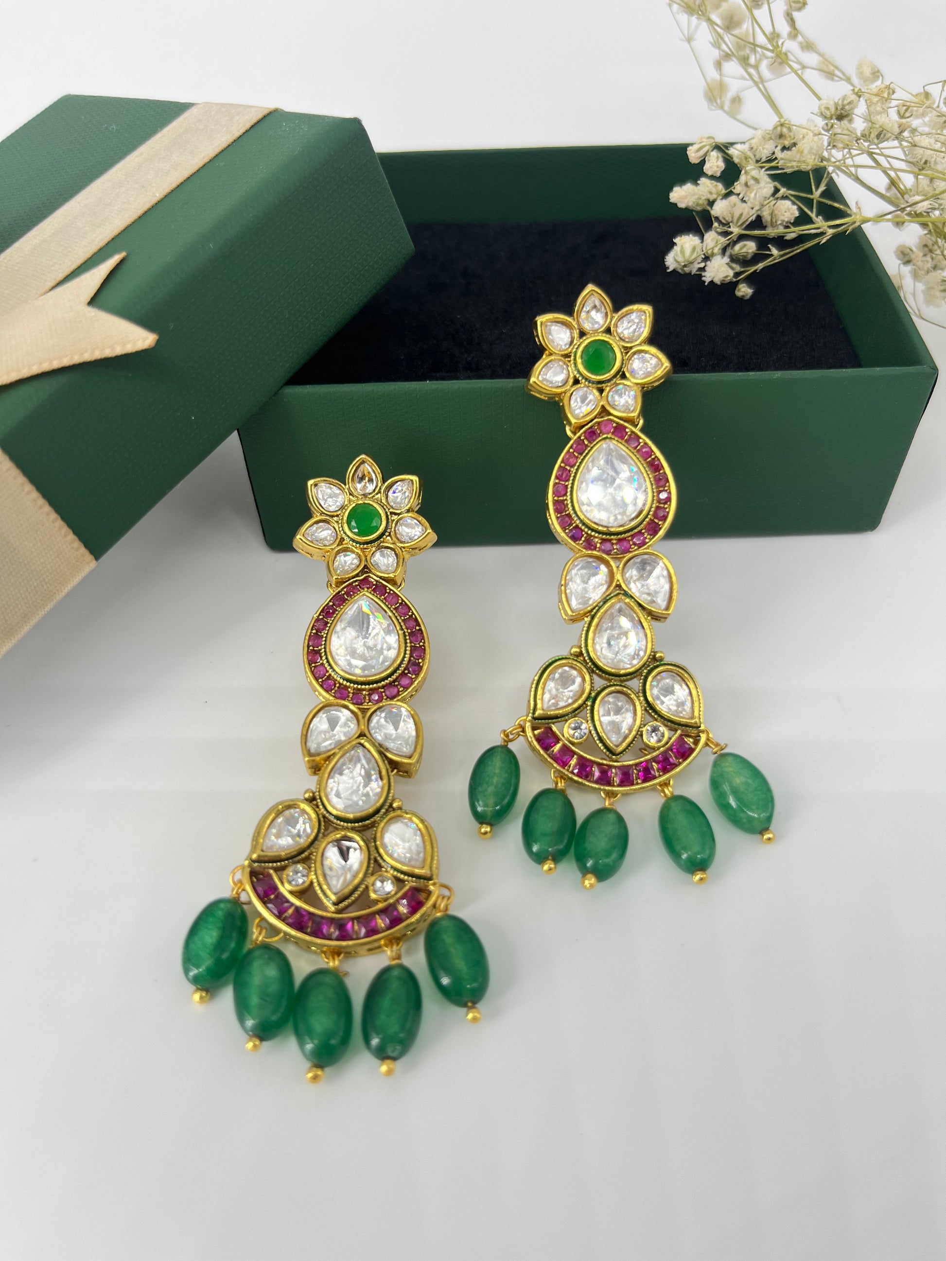 Inspired by nature’s elegance, these floral Kundan earrings feature a vibrant red center stone surrounded by intricate Kundan petals. Finished with delicate green bead danglers, they add a perfect pop of color and tradition to your festive ensemble.