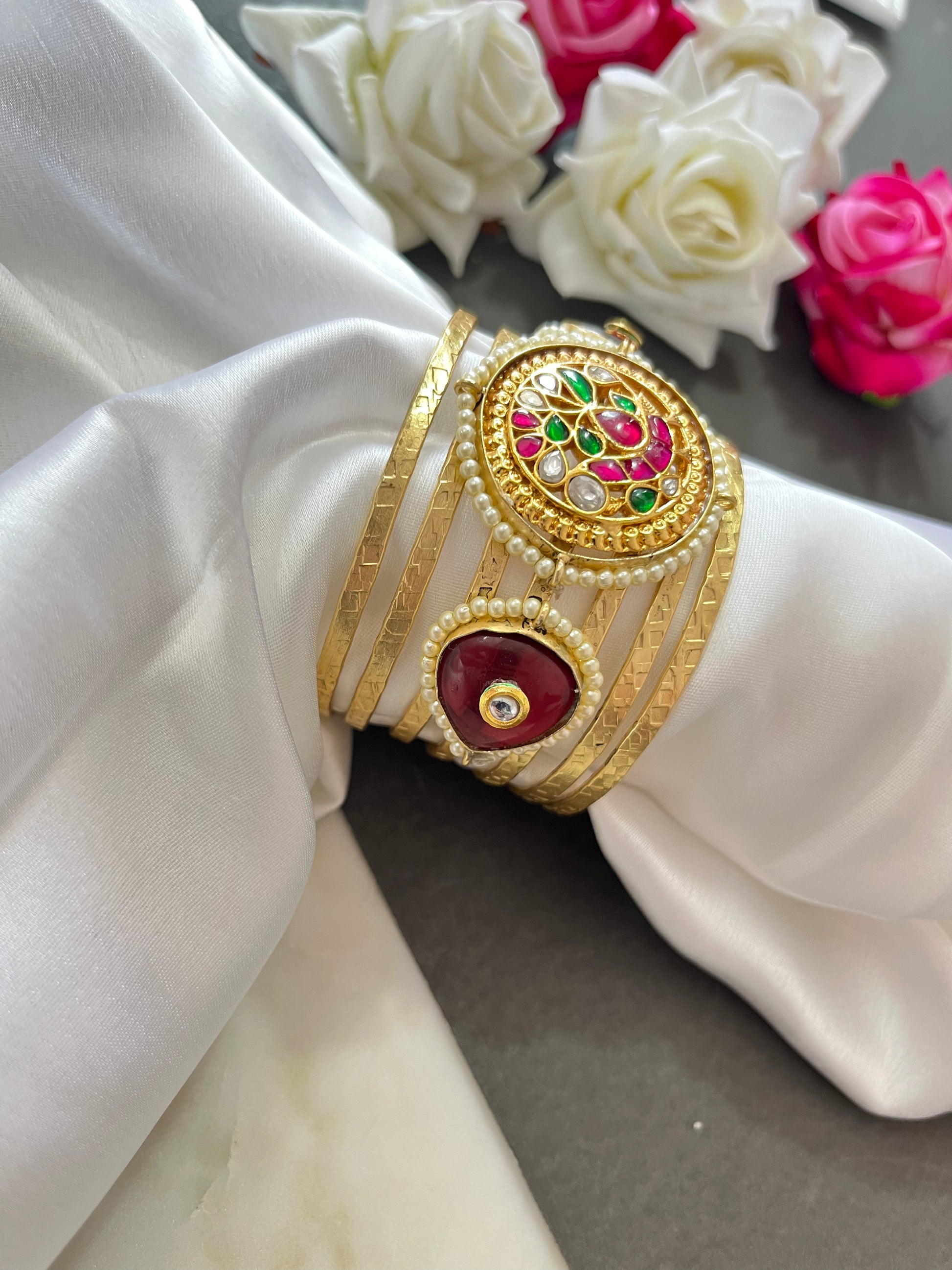 Elevate your wrist with our Jadau Fusion Bangle adorned with Imitation Stones. Blending traditional craftsmanship with contemporary flair, this bangle exudes opulence and style. Make a statement with this exquisite piece that captures the essence of elegance and heritage.