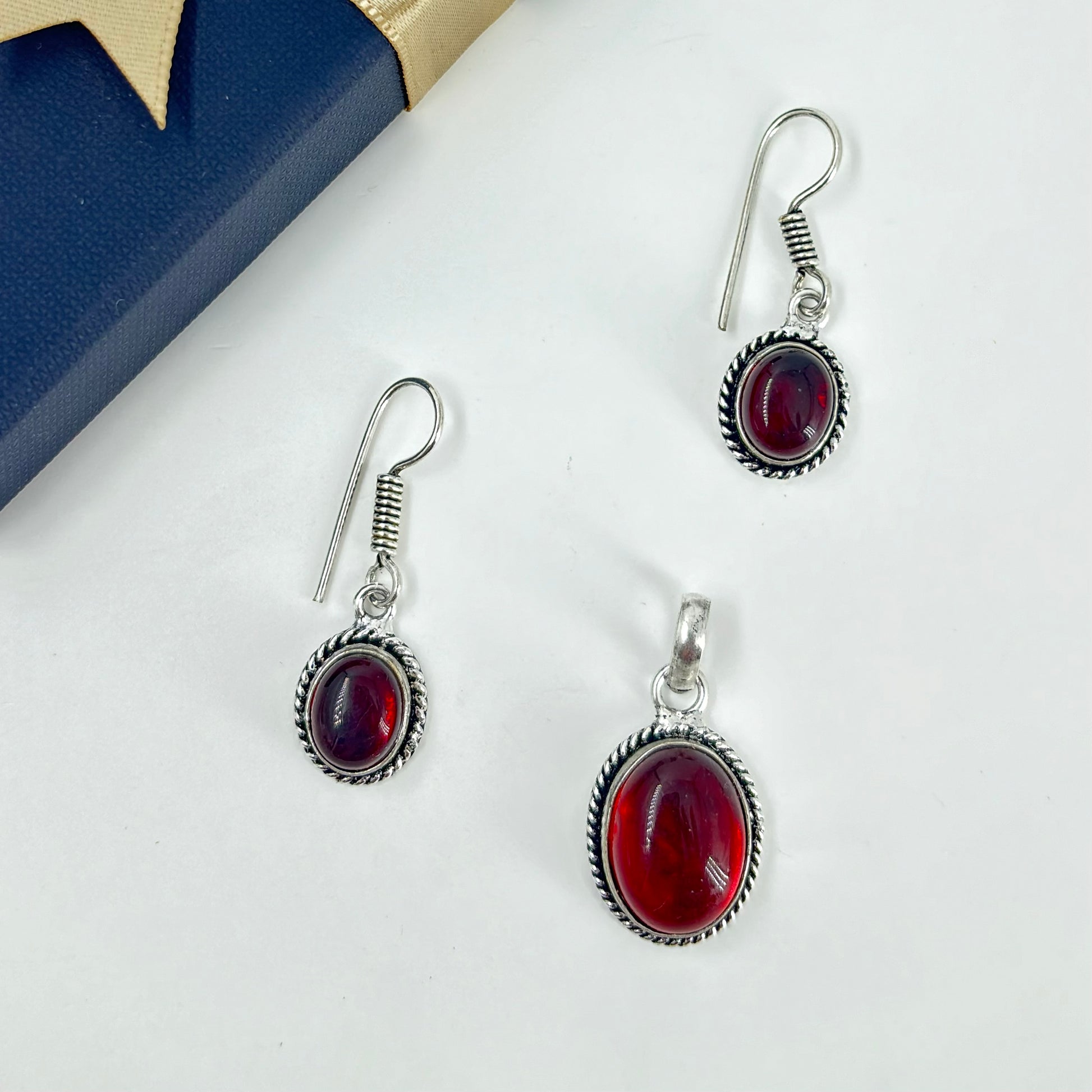 Add a touch of elegance with this stunning natural Garnet stone pendant & earring set! Featuring deep red hues and silver-toned detailing, this set is a perfect blend of sophistication and tradition. 🌿